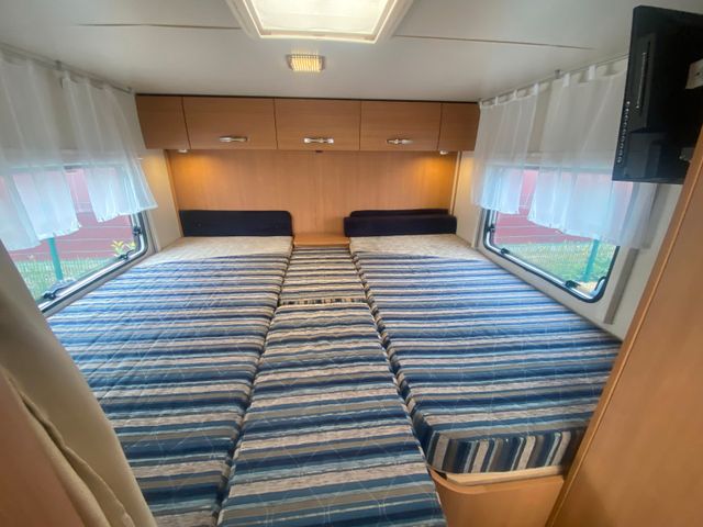 6-Gang Schaltgetriebe TÜV / GAS Neu Öl-Service Neu Tempomat Klimanlage im Fahrrerhaus 5 eingetragene Gurtplätze Radio, CD 1 Jahr Premium Plus Garantie Ohne Werkstattbindung Drehbare Sitze mit Armlehne Airbag Fahrer & Beifahrer Panorama-Dachhaube / Sunroof Markise Fliegengitter und Verdunklungrollos an allen Fenstern Solaranlage 130W TV mit Aussen-TV Anschluss Webasto Dieselstandheizung Boiler Fahrradträger für 4 Fahrradträger Kühlschrank mit separatem Gefrierfach 3 Flammen Kocher Kleiderschrank Badezimmer mit Separater Dusche Einzelbetten Links: 195X80 Rechts: 175x80 Hubbett: 180x135/115 3500 kg zulässiges Gesamtgewicht 3044 kg Leergewicht L: 7259 B: 2300 H: 2890-Besichtigungen sind zu unseren regulären Öffnungszeiten möglich!Öffnungszeiten:Mo. – Fr. 09.00 – 18.00 UhrSa. 10.00 – 14.00 Uhr