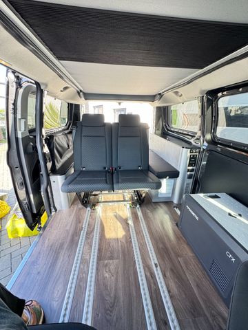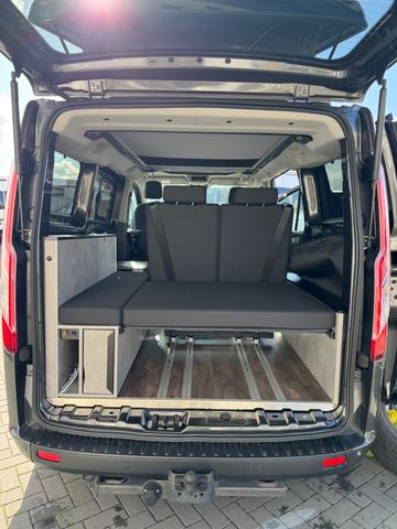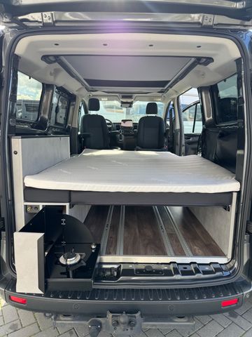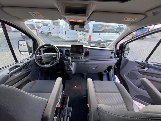 1. Ausstattungspaket: Sicht-Paket 3 inkl. Audiosystem 21 Winter- und Sommerreifen. Voll-LED Scheinwerfer Nebelscheinwerfer mit statischem Abbiegelicht Fernlicht-Assistent Fahrspurhalte-Assistent mit Müdigkeitswarner Außenspiegel elektrisch einstellbar, beheizbar, mit integrierten Blinkleuchten Scheinwerfer-Abblendlicht mit Ausschaltverzögerung Park-Pilot-System vorn und hinten Schiebetür rechts inkl. Trittstufe Wärmeschutzverglasung ab 2. Sitzreihe (mittlerer Tönungsgrad)----2. Sicherheits- & Assistenzsysteme Berganfahrassistent Seitenwind-Assistent Elektronisches Sicherheits- und Stabilitätsprogramm (ESP) Traktionskontrolle (TCS) Notbremsunterstützung inkl. Notbremslicht Anhängerstabilisierung Antiblockiersystem (ABS) mit elektronischer Bremskraftverteilung (EBD) Sicherheits-Bremsassistent Fahrer- und Beifahrerairbag Sicherheitsgurtstraffer und -kraftbegrenzer mit Gurtwarnsystem Überrollschutz Start-Stopp-System----3. Komfort & Innenraum Sitzpaket 13: Fahrersitz 4-fach manuell verstellbar mit Lendenwirbelstütze Beifahrer-Doppelsitz mit integriertem Tisch/Tablett Stoffbezüge „Ebony“ (schwarz) Komfort-Drehsitze (Fahrer & Beifahrer-Einzelsitze) mit Armlehnen und Lendenwirbelstütze Klimaanlage vorn inkl. Staub- und Pollenfilter Bordcomputer Zentralverriegelung mit Fernbedienung Zweiter klappbarer Fahrzeugschlüssel mit Fernbedienung Fensterheber vorn elektrisch mit Quickdown/-up-Funktion (Fahrerseite) Innenbeleuchtung vorn mit Leselampen und Verzögerungsschaltung Lenksäule höhen- und tiefenverstellbar Lederlenkrad Handschuhfach abschließbar Heckklappe mit beheizbarer Heckscheibe Heckscheibenwischer Ford Easy Fuel (Komfort-Tankverschluss mit Fehlbetankungsschutz) Kraftstofftank 70 l----4. Infotainment & Konnektivität Connected Radio Ford Audiosystem 17 mit 4"-Multifunktionsdisplay Integriertes Bedienfeld mit Audio-Fernbedienung am Lenkrad Digitalradio (DAB+) Bluetooth®, USB-Anschluss, Freisprecheinrichtung Zwei Lautsprecher FordPass Connect: Live-Traffic-Verkehrsinformationen WLAN-Hotspot----5. Räder & Karosserie Leichtmetallräder mit Allwetterbereifung Stoßfänger vorn und hinten lackiert in Wagenfarbe Anhängevorrichtung fest Panorama-View Aufstelldach in Schwarz Dachreling rechts und links----6. Camping-/Wohnmobil-Ausstattung Schlafsitzbank für 2 Personen Flexboard (herausnehmbar) inkl. Polster als Schlafbankverlängerung Dometic Kühlbox Zwei Stauraumkisten hinter dem Fahrersitz Ausklappbarer Gaskocher im Heckunterschrank Stauraum für Gasflasche (1,8 kg Füllgewicht) 16 l Frischwassertank (herausnehmbar) mit Pumpe Außendusche (über Frischwasser nutzbar) Schwanenhalsleuchten mit USB-Anschluss Staunetz unter dem Schlafboden an der Multifunktionslichtleiste Multifunktionslichtleiste dimmbar mit Keder für weitere Staunetze----7. Heizung Dieselstandheizung mit Wandbedienpanel